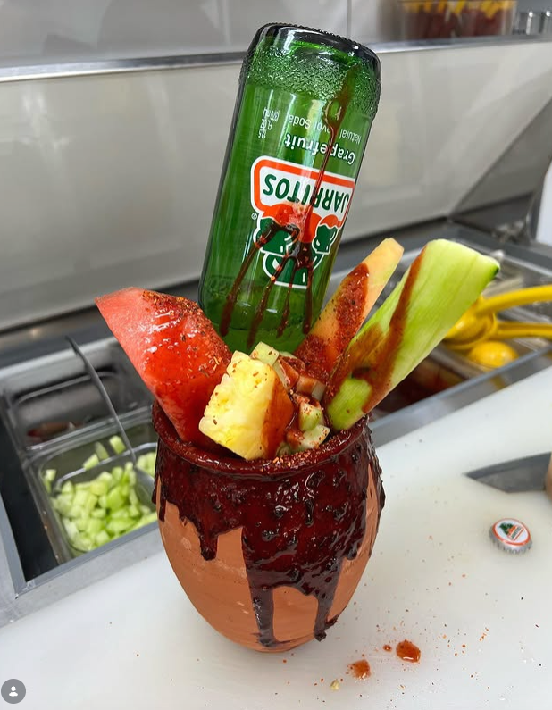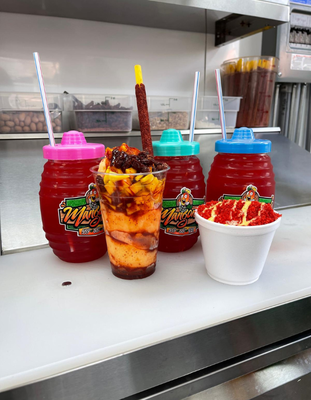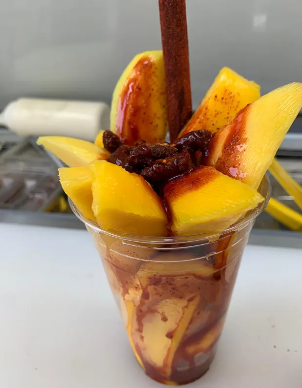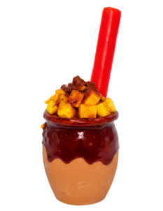 Mango fresco recién cortado, nieve, chamoy de la casa, dulces de tamarindo, banderilla de tamarindo y una refrescante paleta de hielo — todo dentro de un cantarito de barro escarchado con chamoy de la casa.