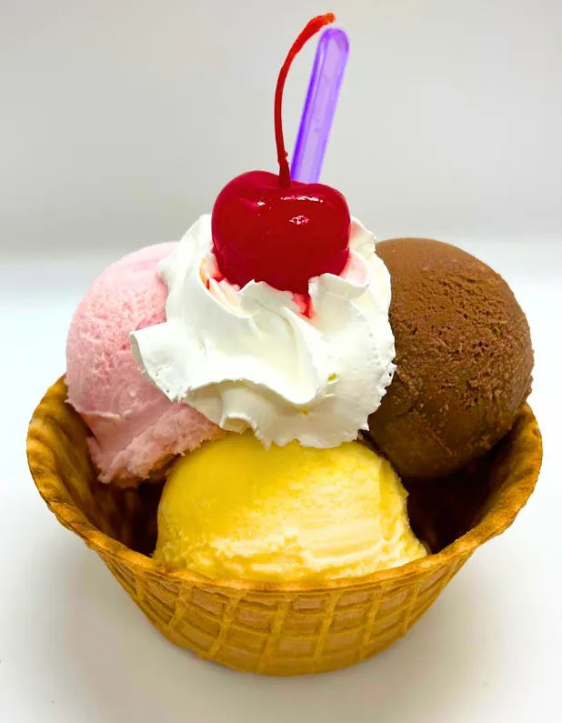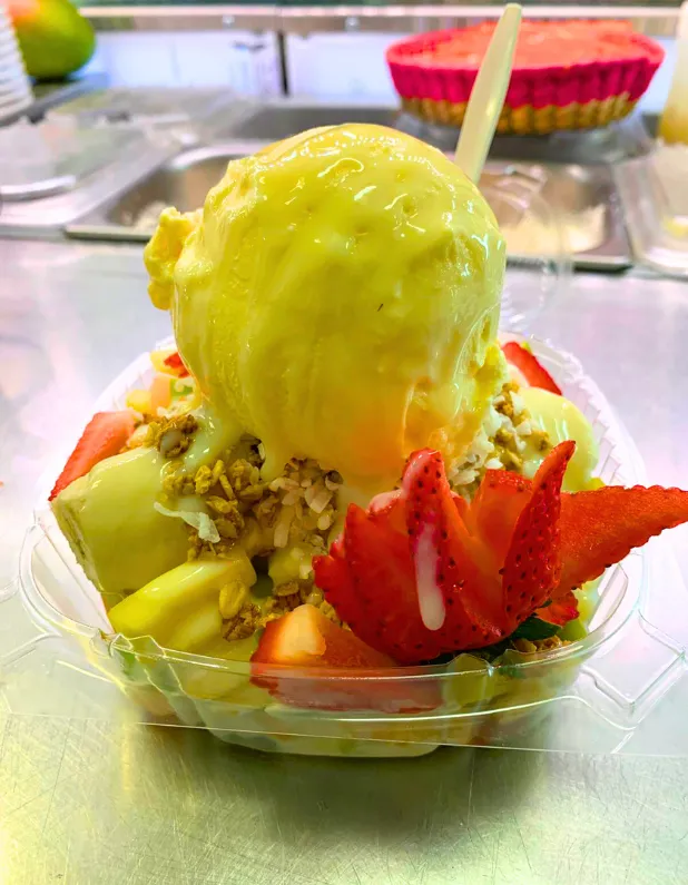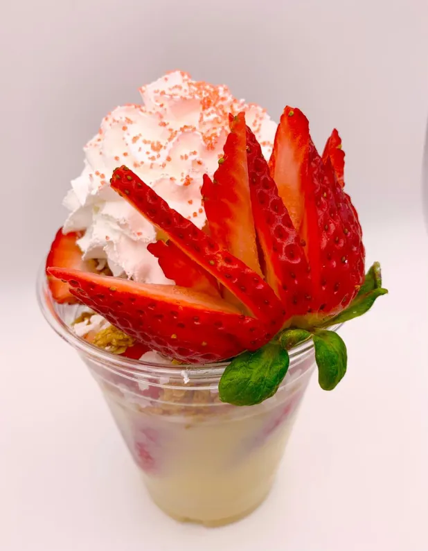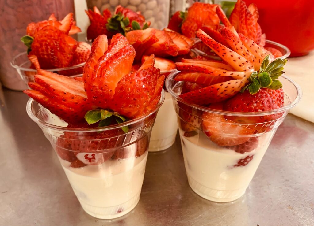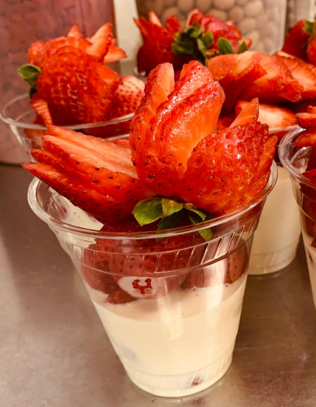 Vasos de fruta recién cortada, incluyendo nuestras famosas fresas con crema.